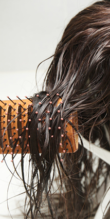 ガイコツブラシ(目が粗く櫛先が丸いブラシ)で、髪がもつれないように一定方向にブラッシングしてください。